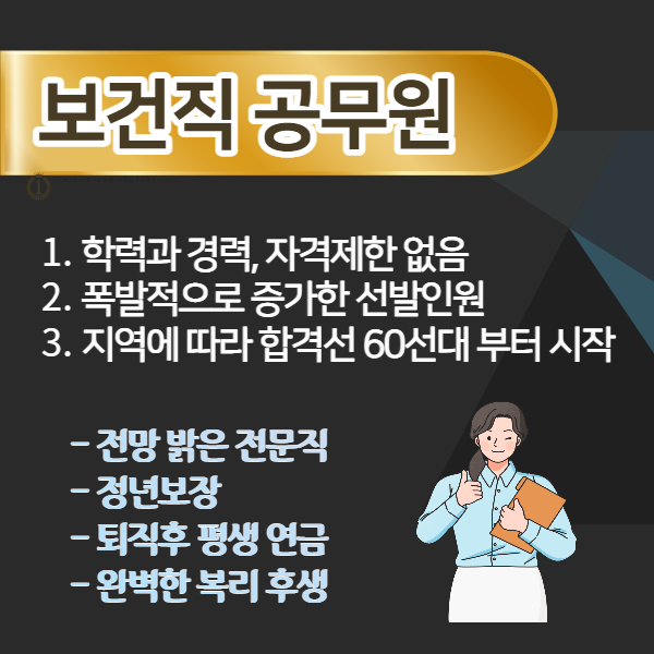 3. 퇴직 후에는 평생 연금 혜택 : 보건직 공무원은 60세 정년이며 퇴직 후에는 국가 연금이 평생 지급됩니다.